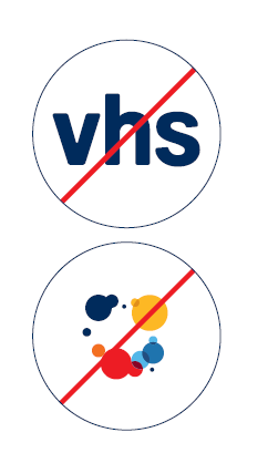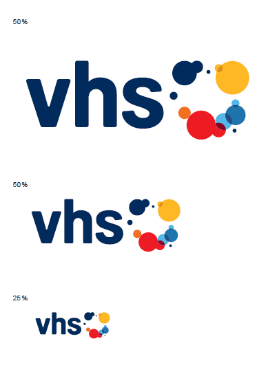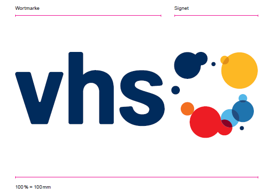 Das Markenzeichen der vhs setzt sich aus zwei Teilen zusammen: der Wortmarke „vhs“ und dem Signet. Die Originalgröße des Markenzeichens entspricht einer Breite von 100 mm bei 100 %. Das vhs Markenzeichen wird als Ganzes in der Kombination Wortmarke und Signet verwendet. Eine Trennung oder ein einzelner Einsatz von nur der Wortmarke oder dem Signet ist nicht zulässig.