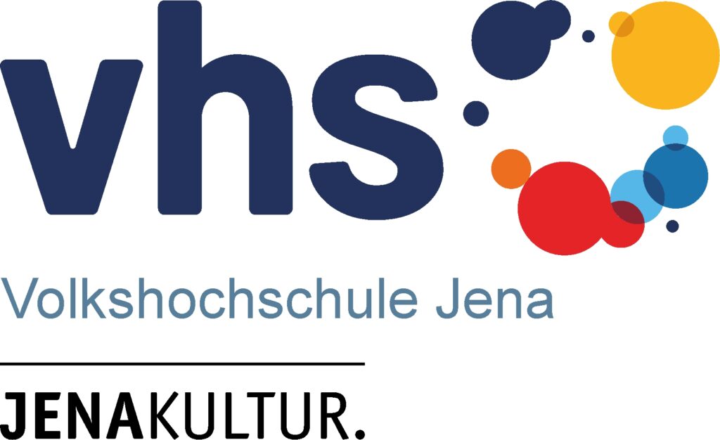 vhs-Logo in dunkelblau mit bunten Kreisen an der Seite, daneben der Schriftzug "Volkshochschule Jena" und die Unterzeile "JENAKULTUR."