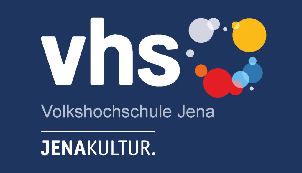 vhs-Logo in weiß mit bunten Kreisen an der Seite, daneben der Schriftzug "Volkshochschule Jena" und die Unterzeile "JENAKULTUR." auf dunkelblauem Hintergrund.
