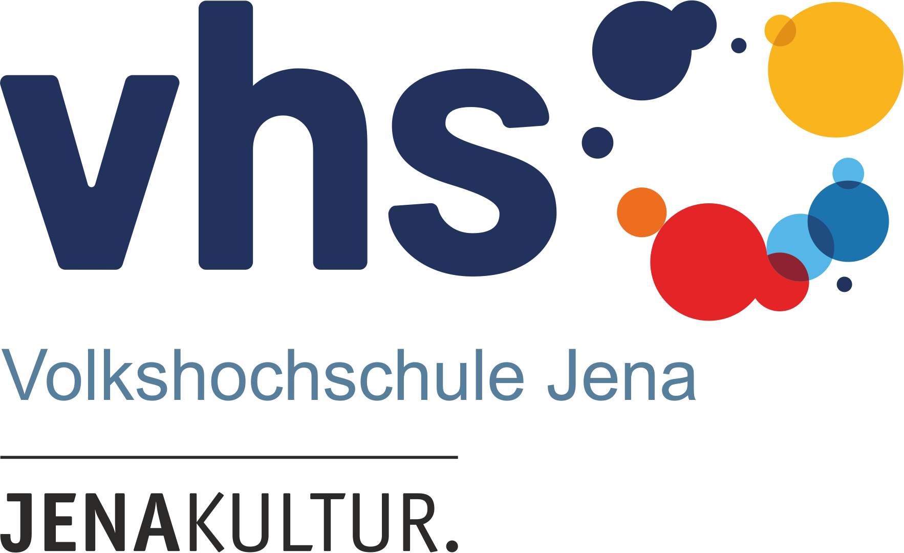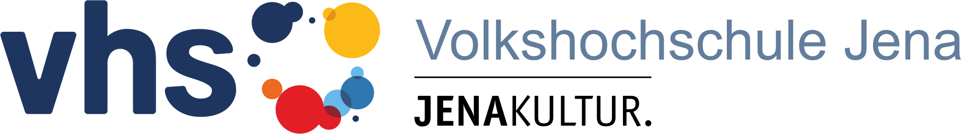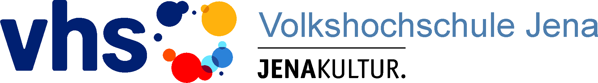 vhs-Logo in dunkelblau mit bunten Kreisen an der Seite, daneben der Schriftzug "Volkshochschule Jena" und die Unterzeile "JENAKULTUR."