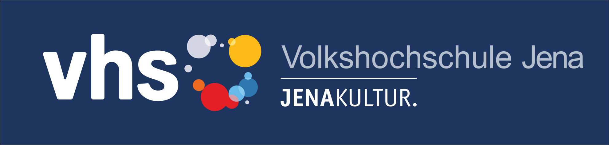 vhs-Logo in weiß mit bunten Kreisen an der Seite, daneben der Schriftzug "Volkshochschule Jena" und die Unterzeile "JENAKULTUR." auf dunkelblauem Hintergrund.