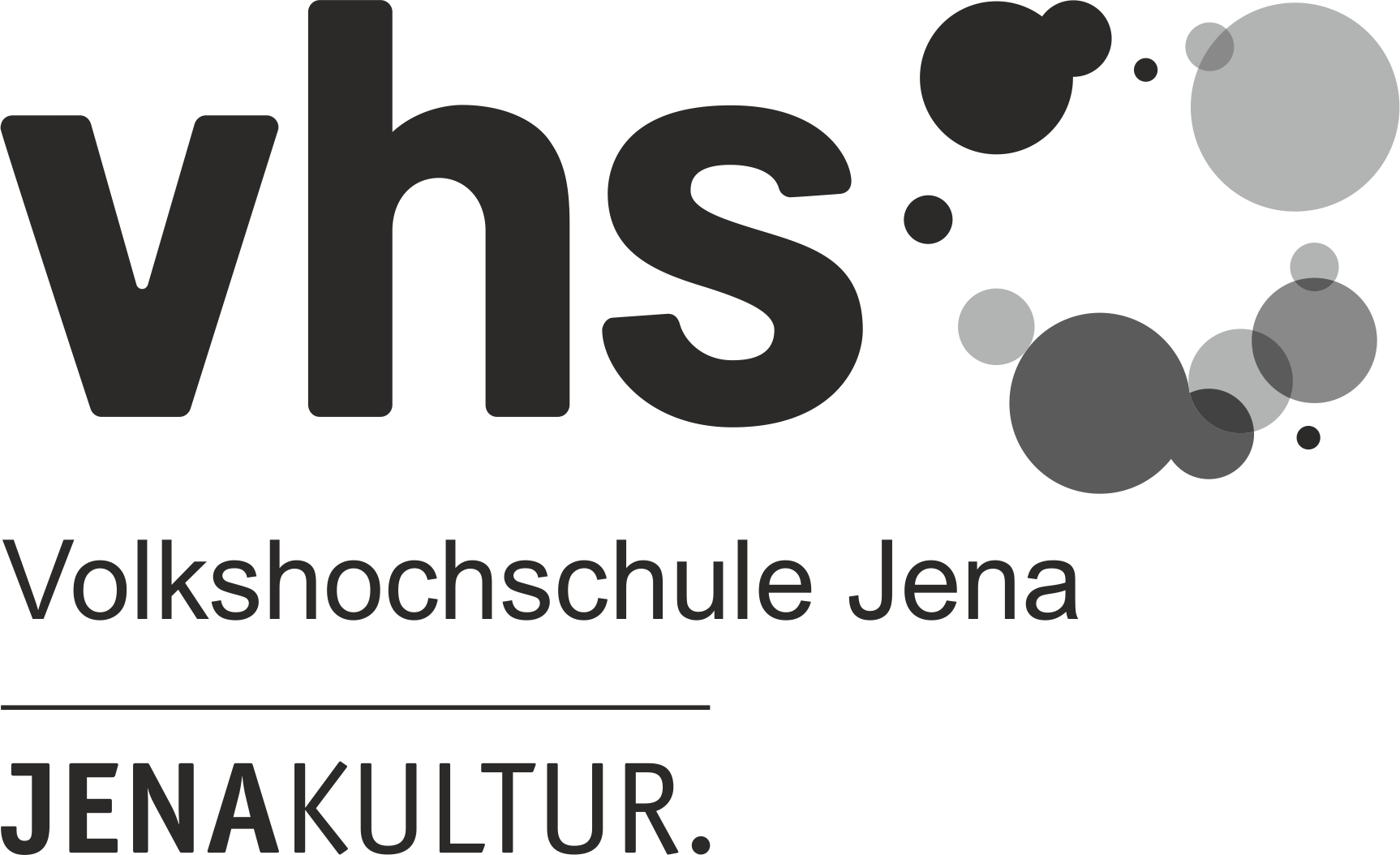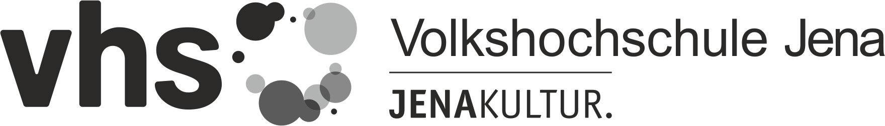 In schwarz geschriebenes vhs mit daneben stehenden Kreisen in Graustufenfärbung. Unten drunter der Schriftzug "Volkshochschule Jena" und "JenaKultur."