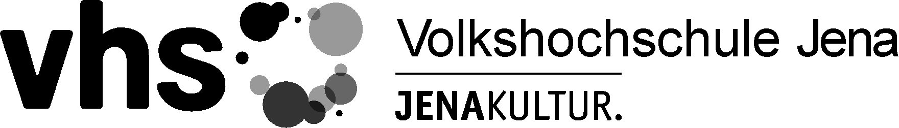 vhs-Logo in schwarz-weiß mit Kreisen an der Seite, daneben der Schriftzug "Volkshochschule Jena" und die Unterzeile "JENAKULTUR."